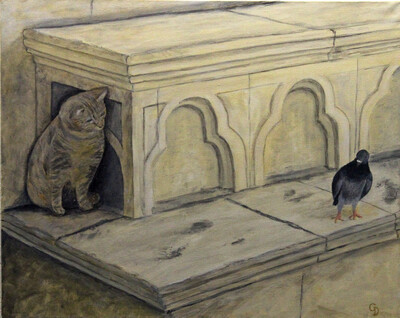 289 - Jeune chat et vieux pigeon, mefiance reciproque.